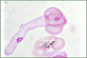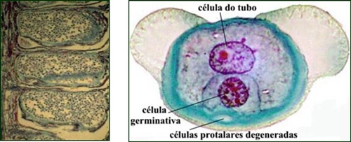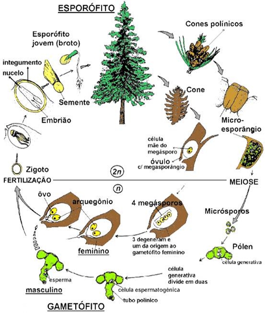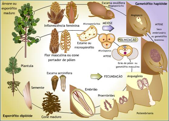 Grão de pólen de pinheiro com tubo polínico A polinização ocorre na primavera. O pólen chega directamente aos óvulos. O micrópilo de cada óvulo produz uma gota de líquido pegajoso, à qual se adere o pólen. Logo, esta gota evapora-se e os grãos de pólen são arrastados ao interior do óvulo até entrar em contacto com o nucelo. As escamas ovulíferas do cone, que estavam abertas, fecham-se, cumprindo então um papel de protecção. O grão de pólen germina, formando o tubo polínico, que vai crescendo lentamente através do nucelo. Apenas um mês mais tarde, o megasporócito ou célula-mãe dos esporos divide-se, por meiose, originando quatro megásporos, três dos quais degeneram. O megásporo funcional inicia a formação do gametófito feminino (megagametófito) por repetidas divisões mitóticas, que não são acompanhadas pela formação de paredes celulares. Cerca de 12 meses depois, o megagametófito está formado por uns 2000 núcleos livres e somente aí é que começa a formação das paredes celulares. Aos 15 meses deslocam-se até ao micrópilo dois ou três arquegónios contendo, cada qual, uma oosfera ou gâmeta feminino. O resto do tecido do gametófito feminino carrega-se de substâncias nutritivas, transformando-se no endosperma primário. Também nesta época, o gametófito masculino chega à maturidade: a célula geradora divide-se para formar uma célula estéril (célula do tubo) e outra espermática, que se divide, por sua vez, em dois núcleos espermáticos (gâmetas masculinos), antes que o tubo polínico alcance o gametófito feminino. A fecundação ocorre na primavera do ano seguinte. Um dos gâmetas masculinos unem-se à oosfera e o outro degenera-se. Geralmente são fecundadas as oosferas de todos os arquegónios e inicia-se a formação dos respectivos embriões (poliembrionia polizigótica), mas somente um deles se desenvolve completamente. Na região inferior de cada arquegónio, a partir do zigoto originam-se quatro embriões geneticamente idênticos, por divisão longitudinal e separação lateral de quatro fileiras de células (poliembrionia homozigótica). Cada embrião possui um suspensor na região superior, que tem como função empurrar o embrião em desenvolvimento até o gametófito feminino, fazendo-o penetrar no tecido nutritivo. Finalmente, apenas um embrião sobrevive; depois de algum tempo o embrião desenvolve uma radícula e um número variável de cotilédones. Durante o processo, o tegumento transforma-se em cobertura seminal. A semente é uma combinação de duas gerações esporofíticas diplóides (uma é a cobertura seminal mais os restos do nucelo e outra é o embrião) e uma geração gametofítica haplóide, o endosperma primário, tecido nutritivo ou alimentício. O ciclo completo leva, normalmente, dois anos, quando as sementes caem dos cones. As escamas ovulíferas tornam-se lenhosas e abrem-se, e as sementes são transportadas pelo vento graças à ala do tegumento, formada por uma porção delgada da escama ovulífera. Isto sucede-se no Outono, dois anos depois da aparição inicial dos cones e da polinização. Esquema do ciclo de vida do pinheiro