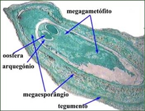 Cone masculino com sacos polínicos de pinheiro Grão de pólen de pinheiro Os cones femininos são de maior tamanho e complexidade que os portadores de pólen. São formados por brácteas dispostas em espiral ao redor de um eixo, formando uma inflorescência chamada estróbilo. Na axila de cada bráctea estéril encontra-se uma flor feminina constituída somente pelo carpelo, que recebe o nome de escama ovulífera. Cada escama tem dois óvulos na parte superior. Cada óvulo apresenta um tegumento e um nucelo multicelular (o megasporângio), no qual se diferencia apenas uma célula-mãe dos megásporos ou megasporócito.