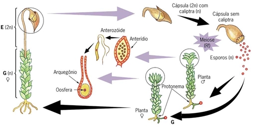 CICLO DE VIDA DO MUSGO: Os musgos são geralmente dióicos, o que significa que a planta ou é masculina ou é feminina, isto é, os sexos encontram-se separados.