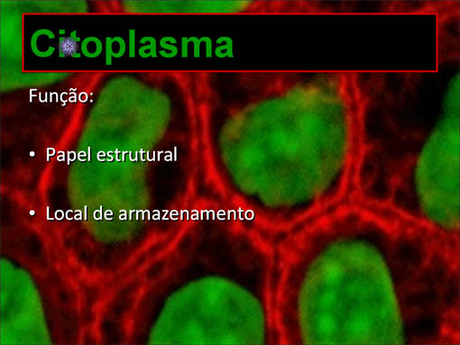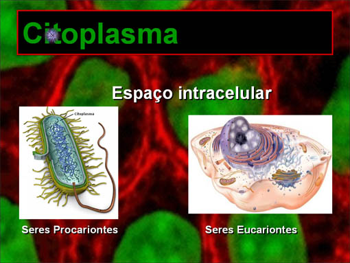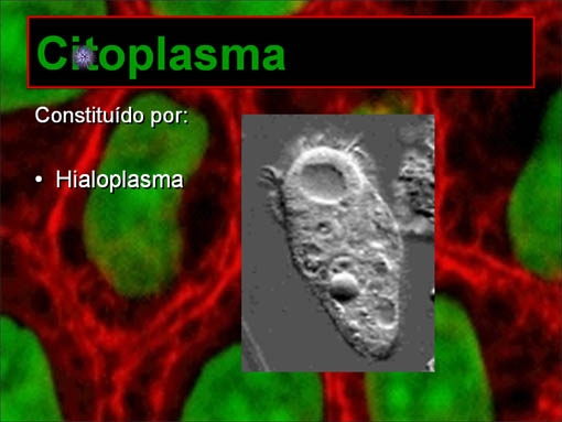 Citoplasma O citoplasma é o espaço (intra-celular) compreendido entre a membrana plasmática e o envoltório nuclear (núcleo) nos seres eucariontes, enquanto que nos procariontes o citoplasma é toda a área celular. O citoplasma desempenha um papel estrutural, mantendo a consistência e a forma da célula. É também o local onde são armazenadas as substâncias químicas indispensáveis à vida. Aqui, ocorrem as reacções metabólicas vitais (glicólise anaeróbia e síntese proteica). O citoplasma é constituído por uma massa semi-fluida e coloidal, o hialoplasma. Este é, um componente aquoso (cerca de 80%) composto por iões e macro moléculas como enzimas, hidratos de carbono, sais, proteínas, e uma grande proporção de RNA (ácido ribonucleico). O hialoplasma pode variar na sua consistência gelificada, o que depende das condições do meio e da fase de actividade em que a célula se encontra. Quanto mais viscoso é chamado ectoplasma ou citogel, e quanto mais aquoso é denominado endoplasma ou citosol composto por líquido em movimento. As regiões exteriores da célula são mais viscosas que o interior. O citoplasma também contém uma componente não solúvel, na qual se encontram dispersos os organelos celulares, que são: mitocôndrias, lisossomas, ribossomas, peroxissomas, vácuolos, citoesquelo, retículo endoplasmático e o aparelho de golgi (estruturas membranares), bem como cloroplastos (células vegetais) e centríolos (células animais). Apesar de todas as células possuírem citoplasma, as suas características são diferentes das células animais para as vegetais. Nas células animais, o citoplasma ocupa cerca de metade do volume da célula, enquanto que nas células vegetais, este ocupa menos espaço devido a existência de vacúolos de maiores dimensões.