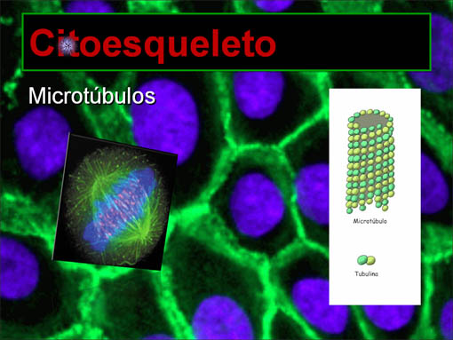 Citoesqueleto Formado por proteínas filamentosas/tubulares que são responsáveis por manter a forma da célula e auxiliam os movimentos celulares. Microtúbulos São os filamentos formados por tubulinas – proteínas que são constituídas por duas subunidades α (alfa) e β (beta). Quando varias tubulinas se ligam – a ponte de uma alfa com uma beta formam filamentos e, treze desses filamentos formam microtubulos – que são as proteínas filamentosas mais grossas e espessas. Filamentos de Actina Possuem dois profilamentos que são constituídos por actina (proteína). Quando estes dois profilamentos se entrelaçam formam um filamento – foram proteínas filamentosas finas. Filamentos intermediários Têm uma espessura entre os microtubulos e os filamentos de actina – dai o seu nome. Não alteram a sua forma ou tamanho, ao contrário dos filamentos de actina e dos microtubulos que, quando necessário aumentam e diminuem o seu tamanho.