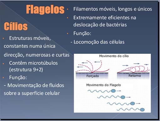 Cílios • Estruturas móveis, constantes numa única direcção, numerosas e curtas • Contêm microtúbulos (estrutura 9+2) • Função: - Movimentação de fluidos sobre a superfície celular