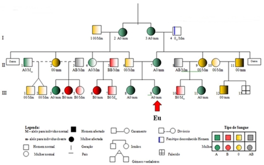 Visão de olho normal Visão de olho míope Objectivo O objectivo deste trabalho é avaliar o modo como se transmitem certas características ou doenças na descendência ao longo de varias gerações. Fazendo a árvore genealógica de uma família é possível apurar a frequência do aparecimento de certas características/doenças, ou seja, o número de membros afectados pela característica em estudo e é possível determinar se existe dominância na família, caracterizando assim a família. Material e método utilizados Uma árvore genealógica é um histórico de certa parte dos ancestrais de uma pessoa ou família. Mais especificamente, trata-se de uma reprodução figurada genealógica para mostrar as afinidades familiares entre indivíduos. Assim sendo é necessário realizar uma pesquisa para obter os dados da característica em estudo, tais como o número de indivíduos infectados/portadores. Foi necessário entrevistar alguns familiares para saber se sofriam ou não de miopia e se os seus ancestrais e descendentes também sofriam. No caso do tipo de sangue foi igualmente necessário recorrer a entrevistas e também há observação dos cartões do grupo sanguíneo, no caso de não saberem o seu tipo de sangu Resultados e discussão Estudo da herança do grupo sanguíneo e da miopia