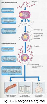 Contudo, a maioria das alergias tem origem alimentar. Na maioria dos casos, os alergénios são produtos usados na nossa dieta diária (ovos, leite, cereais como o trigo e o centeio, entre outros). Quanto maior for a quantidade proteica presente num determinado alimento, maior será a possibilidade deste desencadear uma reacção alérgica. Isto deve-se ao facto de, quanto maior for a proteína, mais difícil se torna a sua digestão. Assim, muitas vezes, entram proteínas inteiras na circulação sanguínea, podendo, desta forma, ser interpretadas pelo organismo como corpos estranhos, e combatidas como tal, libertando-se para o efeito determinadas substâncias como, por exemplo, a histamina, e desencadeando uma reacção alérgica. A reacção alérgica acontece em duas fases (Fig.1): . Fase de sensibilização . Resposta secundária. Na 1ª exposição a um alergénio o sistema imunitário enfraquece. Nas posteriores exposições, ocorre uma reacção alérgica que pode ir de uma erupção cutânea a diversos problemas respiratórios. Existem diversos tipos de reacções alérgicas e que variam de pessoa para pessoa. Podemos, então, definir a alergia como uma resposta exagerada do sistema imunitário a uma substância estranha ao organismo, ou seja, uma hipersensibilidade imunitária a um estímulo externo ou interno específico. As reacções alérgicas podem manifestar-se de imediato (hipersensibilidade imediata), havendo um tipo mais frequente chamado choque anafilático, ou num período mais prolongado, após o contacto com o alergénio (hipersensibilidade tardia), dividindo-se, também, em três importantes tipos: citotóxico, imunocomplexos e celular. A Hipersensibilidade imediata ocorre quando um dado indivíduo produz grandes quantidades de imunoglobulina E (IgE) de forma a proteger-se de grãos de pólen, por exemplo. Os mastócitos (nos tecidos) e os basófilos (no sangue) ligam-se à IgE, fazendo com que haja libertação de histamina. Esta provoca sintomas como a vasodilatação, a inflamação e dificuldades respiratórias. Se uma reacção alérgica não for tratada com um anti-histamínico pode mesmo provocar a morte nas situações mais graves, devendo ser efectuados testes de detecção de sensibilidades. . Tipo I ou Choque anafilático é uma reacção alérgica intensa que ocorre minutos após a exposição a um alergénio (aproximadamente um quarto de hora depois). Esta reacção é mediada por determinadas substâncias como a histamina, em células da mucosa respiratória, mucosa intestinal e epiderme, e por determinados leucócitos (mastócitos e basófilos). À medida que a reacção progride, algumas substâncias com alto poder inflamatório são sintetizadas. Quando ocorre um choque anafilático, na maioria dos casos, o indivíduo fica lívido, com a pele fria, sente uma ansiedade extrema, podendo mesmo desmaiar. A Hipersensibilidade tardia leva mais de 12 horas a manifestar-se à exposição ao alergénio. Neste caso, o alergénio é processado por células apresentadoras de antigénios e é iniciada uma resposta mediada por células. Esta resposta pode ser tão intensa que a quantidade de citocina libertada é capaz de activar macrófagos e lesionar tecidos. (Ex: quando bactérias que causam a tuberculose colonizam os pulmões.) . Tipo II ou Citotóxico é uma reacção que ocorre, por exemplo, em algumas doenças auto-imunes como a tiróidite, onde a pessoa forma anticorpos contra elementos (órgãos e tecidos) de si próprio. São bons exemplos disso a rinite alérgica, certos tipos de asma brônquica aguda, ou reacções alérgicas a drogas. . Tipo III ou Imunocomplexos é uma reacção que se caracteriza pela formação de complexos antigénio - anticorpo (imunocomplexos), os quais se depositam em tecidos ou entram na circulação sanguínea. Os imunocomplexos atraem mediadores da inflamação, o que determina lesões localizadas em certos órgãos ou espalhadas por todo o corpo. . Tipo IV ou Celular é uma reacção mediada por linfócitos e seus produtos, as linfocinas, libertadas mediante o contacto com o antigénio, cujo exemplo típico é a reacção tuberculínica, encontrando-se este mecanismo também na rejeição de transplantes e nas chamadas dermatites de contacto. As doenças alérgicas mais frequentes desencadeadas por estas reacções são: