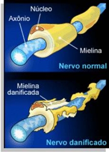 Figura 3 – Comparação entre um nervo normal e um danificado. Consequências Emergindo como resultado da Esclerose Múltipla, existem uma multiplicidade de sintomas que podem significar que as consequências físicas, cognitivas e psicossociais desta doença são, com frequência, muito abrangentes, variáveis e complexas, influenciando a vida quotidiana dos portadores. Assim, segundo a National Multiple Sclerosis Society - NMSS (2008), um programa de intervenção desenvolvido especificamente no âmbito desta patologia, pode ajudar a lidar com mudanças, alterar ambientes para reduzir as limitações e orientar os portadores para a aquisição de estratégias física e emocionalmente vantajosas, podendo ainda desenvolver relacionamentos inter-pessoais ao proporcionar a troca de experiências entre indivíduos. Um dos maiores desafios na prática médica é o diagnóstico de esclerose múltipla. Por ser uma enfermidade com inúmeras formas de apresentação e sem um teste específico, o médico usa de uma série de evidências clínicas e laboratoriais para a determinação do diagnóstico. Os critérios para se estabelecer o diagnóstico da Esclerose Múltipla são clínicos. Utilizam-se as informações da anamnese para caracterizar a presença dos surtos e o exame neurológico para estabelecer correspondência entre os surtos e a estrutura do sistema nervoso central lesada. A confirmação da doença faz-se geralmente por exclusão de todos os outros possíveis estados. Um neurologista pode realizar testes para ajudar a confirmar o diagnóstico, incluindo punções lombares, registos da actividade eléctrica do cérebro, tomografia axial computorizada (TAC) e tomografia por ressonância magnética (RMN) que é a mais utilizada. Quando o médico suspeita de esclerose múltipla, leva a cabo uma investigação exaustiva do sistema nervoso como parte do exame geral. Os sinais que denotam um funcionamento inadequado do sistema nervoso são os movimentos oculares descoordenados, a debilidade muscular ou os entorpecimentos em diferentes partes do corpo. Outros aspectos, como a inflamação do nervo óptico e o facto de os sintomas aparecerem e desaparecerem, permitem estabelecer o diagnóstico com bastante fiabilidade. As análises laboratoriais, já referidas, costumam distinguir entre esclerose múltipla e outras doenças com perturbações semelhantes pois em pessoas com esclerose múltipla, os valores de glóbulos brancos e de proteínas no líquido são ligeiramente superiores aos normais; pode haver também um aumento da concentração de anticorpos e em 90 % dos afectados de esclerose múltipla encontram-se tipos específicos de anticorpos e de outras substâncias. A ressonância magnética (RM) é a técnica de imagem mais precisa para o diagnóstico, dado que pode revelar a presença de áreas do cérebro que perderam a mielina. A RM pode inclusive distinguir áreas de desmielinização activas e recentes de outras mais antigas que se produziram à tempos atrás. As respostas evocadas são exames que registam as respostas eléctricas do cérebro quando se estimulam os nervos, por exemplo, o cérebro normalmente responde a uma luz cintilante ou a um ruído com padrões característicos de actividade eléctrica e em pessoas com esclerose múltipla, a resposta pode ser mais lenta pela deterioração da condução dos sinais ao longo das fibras nervosas desmielinizadas. O diagnóstico não é simples e pode levar alguns anos para ser feito correctamente, pois os sintomas assemelham-se, em alguns casos, com outros tipos de doenças do sistema.