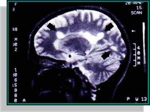 Figura 4 - Ressonância Magnética (RM) Os sintomas da esclerose múltipla são cada vez detectados mais cedo, através das alterações físicas que a doença manifesta. Estas alterações ajudam no diagnóstico, no entanto o diagnóstico também pode ser realizado através de análises sanguíneas e biopsias cutâneas. A esclerose múltipla é uma doença para a qual não existe uma cura, contudo o tratamento tem avançado bastante nos últimos anos, permitindo avaliar os sintomas e as limitações associados a este tipo de doença. Os vasodilatadores e a protecção contra o frio diminuem a síndrome de Raynaud (falta de sensibilidade, dormência nas mãos), avaliam problemas articulares e musculares. O tratamento antecipado combate o aparecimento de lesões irreversíveis ao nível dos axónios, ou seja, das fibras nervosas, deste modo previne-se o progresso da doença. No entanto, quando se manifesta a doença, entre os neurologistas não existe concordância de qual o momento mais indicado para iniciar os tratamentos. Na opinião da maioria dos médicos, após informar previamente os doentes sobre as verdadeiras expectativas a esperar e respeitando aqueles que não concordam com a terapêutica por motivos pessoais, julga-se ser legítimo o tratamento precoce da maioria dos doentes portadores desta doença. Para a esclerose múltipla o tratamento mais indicado começa por conservar um bom estado de saúde geral, mantendo uma alimentação saudável, continuando com uma vida activa, repouso suficiente de forma a sentir-se bem, garantido a forma física e psíquica. Para além dos aspectos mencionados anteriormente, é também essencial um plano de exercício e ginástica muscular, que ajude os doentes a diminuir a tensão muscular, e ainda exercícios de equilíbrio que possa auxiliar o doente a tornar-se mais auto-confiante. Os fármacos também são essenciais, particularmente os relaxantes musculares, que ajudam a reduzir a tensão dos músculos e melhoram os movimentos. Ao longo dos últimos anos, têm vindo a utilizar-se diversificados medicamentos que actuam no sistema imunitário, que são chamados de imunomodeladores, como por exemplo os interferões-beta e o acetato de glatiramero, que ajudam a impedir o progresso da doença.