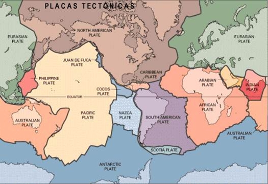 Tectonismo (ou diastrofismo) - da palavra grega diastroféin = distorção) - assim se chamam os movimentos internos da crosta que provocam distorções ou deformações nas placas litosféricas. A cada choque, a placa que apresenta menor viscosidade (mais aquecida) afunda sob a mais viscosa (menos aquecida). Divisões das placas tectónicas As deformações são de duas modalidades: movimentos orogenéticos e epirogenéticos. Orogênese: movimentos horizontais, de curta duração geológica mas de grande intensidade, gerando dobramentos (quando exercidos sobre terrenos incompetentes ou plásticos) e fracturas e falhas (quando sobre camadas de rochas rígidas que oferecem resistência às pressões tectônicas). De modo geral os dobramentos ocorreram nas bordas de bacias sedimentares ou de placas tectónicas. Até hoje, houve 4 períodos de orogênese: o Huroniano (fim do Pré-Cambriano - origem dos escudos cristalinos), o Caledoniano (começo do Paleozóico), Herciniano (fim do Paleozóico) e o Alpino (fim do Mesozóico e começo do Cenozóico - originando os dobramentos modernos). A Epirogênese (épeiron = continente em grego): movimentos diastróficos verticais, de longa duração afectando grandes partes de áreas continentais, provocando o rebaixamento ou levantamento dos litorais e, consequente e respectivamente, as transgressões (invasão do mar, como no Mar do Norte) e regressões marinhas (recuo do mar como na Península Escandinava, que está subindo), além do rejuvenescimento do relevo (os rios aumentam a erosão do seu leito e das margens devido ao soerguimento de parte do continente). Fundamentalmente, existem 3 tipos de contactos entre as placas tectónicas, propocionados por movimentações com sentido divergente, convergente, de deslocamento horizontal ou falha transformante: Movimento entre Placas Divergentes Ocorre quando as placas se movimentam para direcções contrárias entre si. Esse processo acontece principalmente nas áreas ao longo das cadeias meso-oceânicas. Essas cadeias são extensas elevações submarinas, cuja topografia é muito mais acentuada e exuberante do que as tradicionais zonas montanhosas existentes nos continentes - podem alcançar mais de 1.000 km de largura e 20.000 km de extensão e sua crista é marcada por profundas fendas ou fissuras. Quando as placas se afastam uma da outra, o material em estado de fusão - o magma - existente no topo da astenosfera, sobe através das fendas, situadas na crista das cadeias submarinas, e extravasa-se formando um novo fundo oceânico. Movimento de Placas Convergentes Este caso ocorre quando duas placas se chocam. Na maior parte das vezes, uma delas desliza por debaixo da outra, formando profunda trincheira que penetra pelo fundo oceânico. A placa inferior desliza no interior da astenosfera segundo um plano inclinado - entre 40º a 60º com relação a horizontal. Essa região de junção de placas recebe o nome de Zona de Subdução ou Zona de Benioff - Wadati. Mais de 3/4 dos terremotos do mundo ocorrem nesse tipo de limite de placas. É aí também que se encontram os sismos de foco profundo, com 300 a 700 km de profundidade. Ao subsidir para zonas mais profundas da astenosfera, a placa rígida encontra altas temperaturas podendo ser parcialmente fundida. Esse novo magma, que é menos denso que as rochas circunvizinhas, sobe através de zonas de fraqueza da crosta e extravasa-se sob a forma de vulcões. Aproximadamente 2/3 das erupções vulcânicas conhecidas ocorrem nesse tipo de limite de placas. Exemplo clássico de placas convergentes é a de Nazca e a da América do Sul. A interacção do movimento dessas placas possibilitou a formação da Cadeia Andina e a trincheira oceânica Chile-Peru. Movimento Horizontal ou de Falha Transformante Separa placas que estão se deslocando lateralmente. O atrito entre as placas é grande de modo que podem ocorrer grandes esforços e deformações nas rochas que, periodicamente, são libertos por meio de grandes terramotos. Para esse caso, o melhor exemplo é a falha de Santo André, na Califórnia, limitando a Placa Americana, com movimento geral na direção SE, da Placa do Pacífico, com movimento geral na direção NW. Formações pelo tectonismo No meio dos Oceanos Atlântico, Pacífico e Índico existem cordilheiras submarinas, que se elevam a até cerca de 4,000 m acima do assoalho oceânico. Estas cordilheiras, interrompidas transversalmente pelas falhas transformantes, sublinham imensas rupturas na crosta, ao longo das quais há extravasamentos periféricos de lava basáltica vinda das partes mais internas (astenosfera). O mesmo mecanismo que força a cordilheira a se abrir periodicamente (correntes de convecção divergentes) para que materiais mais novos se possam colocar ao longo das aberturas, formando e expandindo o domínio oceânico. Noutros locais, promove colisões de placas (correntes de convecção divergentes). Nestas colisões, a placa que contém crosta oceânica, mais pesada, entra sob a placa continental, que se enruga e deforma, gerando as grandes cadeias continentais (Andes, Montanhas Rochosas). A placa que afundou acaba por se fundir ao atingir as grandes pressões e temperaturas internas (zona de subducção); se a colisão for entre duas porções continentais, ambas se enrugam (Alpes, Pirinéus, Himalaias). Desta forma, a crosta terrestre é renovada, sendo gerada nas cadeias meso-oceânicas e reabsorvida nas zonas de colisões entre as placas, onde ocorre subducção. Assim, oceanos são formados, pela divisão de continentes (por exemplo, há 180 milhões de anos atrás, um grande continente chamado GONDWANA dividiu-se formando a África, a América do Sul e o oceano Atlântico). Outros oceanos podem ser fechados por movimentos convergentes das placas (por exemplo o Mar Mediterrâneo está sendo fechado pela aproximação entre a África e a Europa). TECTÓNICA DE PLACAS