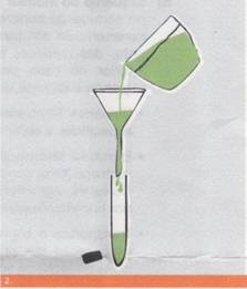 Figura 3 - Filtração da preparação para o tubo de ensaio 5º. Colocar o filtro de café, preferencialmente em leque, de modo a ter a maior superfície de absorção possível, num funil; 6º. Verter através do funil a solução para o tubo de ensaio; 7º. Adicionar álcool à solução filtrada. RESULTADOS: Na região de intersecção entre o álcool e a solução é visível a formação de um novelo fino e branco. Este novelo é o ADN do kiwi.