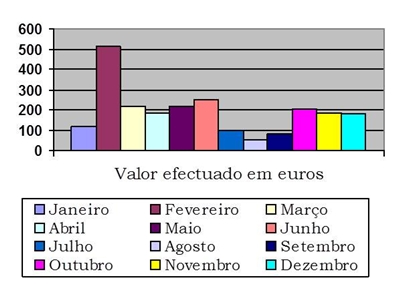 No ano de 2006, como evidencia o gráfico, o mês em que se consumiu mais água foi em Fevereiro. Esse valor muito acima da média não se deve ao facto de se ter consumido assim tanta água. Deve-se à acumulação de água resultante dos meses de Verão, pois os números do consumo de água nessa estação não são mais que uma mera estimativa. Segundo o Conselho Executivo, esse valor acima da média (a média é cerca de 163,08 m3) vem sempre registada ou nos primeiros meses do ano ou em Dezembro. Alguns dos valores mais elevados devem-se a fugas de água. Uma delas foi causada por um aluno e outra por uma ruptura que deixou água a correr durante um fim-de-semana. De seguida apresentamos o consumo de água na nossa escola visto noutra perspectiva, desta vez em euros, com uma média de 91,65 euros por mês: