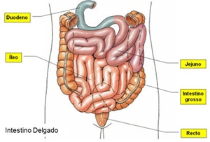 Intestino Delgado à parte mais longa do tubo digestivo. Mede entre seis e sete metros. É formado por: . Duodeno à localizado no inicio do estômago, recebe os sucos produzidos pelo fígado e pelo pâncreas; . Jejuno-íleo à zona de absorção digestiva.