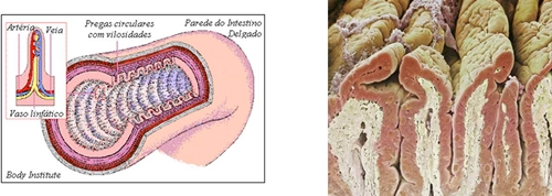 gordura) para que as lipases intestinais possam actuar. O pâncreas produz suco pancreático que possui enzimas digestivas (lípase, amílase e tripsina), lançadas no duodeno, sobre o quimo. Elas iniciam a transformação do quimo no duodeno. No intestino delgado, os movimentos peristálticos misturam o quimo, que é submetido à acção de várias enzimas produzidas pelas superfícies internas do intestino – maltase e peptidases -, assim como secreções lubrificantes (protegem o interior do intestino da acidez do quimo e da acção das suas enzimas digestivas) Como ocorre a absorção de nutrientes? O intestino delgado é a principal área de absorção de nutrientes. Os nutrientes, após a digestão química e mecânica a que foram submetidos, encontram-se agora na sua forma mais simples. A superfície interna do intestino delgado está repleta de pregas, vilosidades e microvilosidades. Estas modificações da superfície do intestino delgado aumentam a área disponível. Permitem uma maior absorção (passagem das pequenas moléculas dos alimentos para os capilares sanguíneos e quilíferos). Após esta absorção, o que resta do quimo vai para o intestino grosso. Lá, são absorvidas água e minerais.