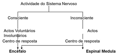 Actos Voluntários do Sistema Nervoso Os actos voluntários são conscientes e dependem da nossa vontade. Exemplos: ler, escrever, comer,… Nestes casos o impulso nervoso é gerado no cérebro e conduzido aos neurónios motores que enervam os órgãos implicados no acto. Nestes actos os centros de resposta situam-se no encéfalo. O encéfalo tem de elaborar um plano de acção de modo que os músculos e outras partes do corpo actuem em conjunto. Este plano provém de áreas motoras do córtex cerebral, que decidem instantaneamente quais os grupos de músculos a utilizar. A mensagem é conduzida do córtex para o bolbo raquidiano e deste para a medula, que a envia, por nervos motores, para os músculos.