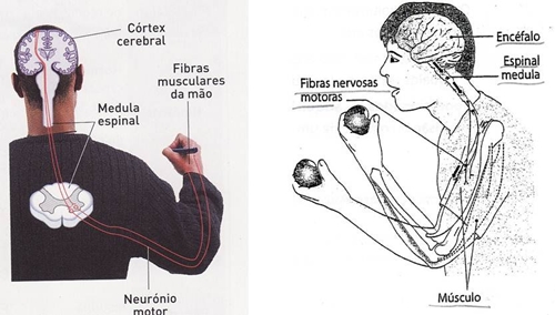A - Antes de pegar na caneta, o cérebro elabora um plano de acção no córtex cerebral, onde é decidido quais os músculos necessários para estender o braço e juntar os dedos para pegar na caneta B - Percurso do influxo nervoso desde o cérebro até aos músculos que permitem levantar o braço para levar a mão até á boca.