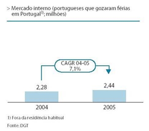 Tipos de Turismo Turismo Interno de Nacionais O turismo nacional dentro do território Português representa 48% da sua totalidade. O turismo interno tem vindo a ganhar maior importância face ao turismo externo. Em 2005 gozaram férias em Portugal 2,4 milhões de Portugueses, um crescimento de 7,1% em relação a 2004.
