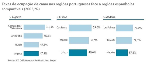 Estas, Representam 85% das Dormidas dos turistas Estrangeiros Mas na verdade, as regiões de Portugal, mesmo as que referimos anteriormente, apresentam taxas de ocupação inferiores quando comparadas com as regiões similares Espanholas. Como se pode comparar no seguinte gráfico: