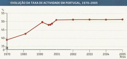 Evolução da taxa de actividade em Portugal A população activa traduz a taxa de actividade, que também tem vindo a aumentar nas últimas décadas, passando de 36,8, em 1970, para 52,5 %. Contudo, e apesar de a taxa de actividade masculina ainda ser superior à feminina, se não considerássemos a crescente entrada da mulher no mercado do trabalho ( a taxa de actividade feminina corresponde a 47,4 %). Nomeadamente em actividades ligadas aos serviços, a taxa de actividade apresentaria uma clara tendência para o decréscimo, motivada sobretudo pelo envelhecimento da população e consequente redução da população activa, pela diminuição da taxa de natalidade e pela entrada mais tardia dos jovens no mercado de trabalho.