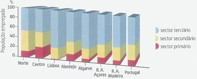NUT II, em Portugal, 4º Trimestre de 2005 e 1º trimestre de 2006 No 1º trimestre de 2006, as taxas de desemprego mais elevadas foram registadas nas regiões: . Do Alentejo, 9,8% . No Norte, 8,9% . De Lisboa, 8,5% Os valores mais baixos registaram-se: . Nas regiões autónomas dos Açores, 4,2 e da Madeira, 4,6%. Comparativamente ao trimestre anterior, a taxa de desemprego diminuiu na generalidade das regiões, com excepção: . Do Alentejo, onde a taxa de desemprego aumentou; . Do Algarve, onde se manteve. As actividades da população activa são muito diversificadas e concentram-se em três sectores de actividade: o sector primário, o secundário e o terciário. O grau de desenvolvimento de um país ou região relaciona-se directamente com a repartição da população activa por sectores de actividade. É grosso modo, mais elevado quanto menor for a população activa no sector primário e maior no terciário. Entre 1950 e 2005, verificaram-se importantes alterações na estrutura profissional da população activa, que testemunham, apesar de tardia, a aproximação económica e social do nosso país aos restantes Estados da EU. Em 1950 o sector primário ainda representava cerca de 50% da população activa, devido ao fraco desenvolvimento socioeconómico do país. Com o passar dos anos, este sector sofreu uma redução na estrutura profissional da população activa, devido à transformação de efectivos para os outros dois sectores de actividade, pelo que, a partir de 1970, passou a ser o sector que menos peso tinha em termos de população activa. Contrariamente, o sector secundário conheceu um crescimento a partir de meados da década de sessenta, mas a modernização tecnológica das indústrias e a sua deslocação para outros países, em busca de mão-de-obra mais barata, tem provocado o decréscimo do emprego neste sector e, consequentemente, a diminuição da sua população activa. Quanto ao sector terciário, foi o que mais cresceu nas últimas décadas, o que se explica por: . Melhoria do nível de vida; . Aumento do número de mulheres nos serviços; . Surgimento de novas actividades; . Desenvolvimento dos serviços sociais e de administração pública; . Desenvolvimento da educação e saúde; . Expansão do comércio; . Desenvolvimento técnico e tecnológico do sector primário e secundário; . Aumento e diversificação do turismo, lazer e cultura. O desigual desenvolvimento das actividades económicas reflecte-se numa distribuição desigual da estrutura profissional em Portugal. Assim: . O sector primário predomina nas regiões do interior; . O secundário é importante nas regiões do Norte e do Centro, onde ainda existem indústrias que necessitam de mão-de-obra intensiva e pouco qualificada