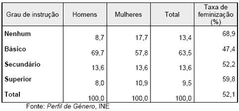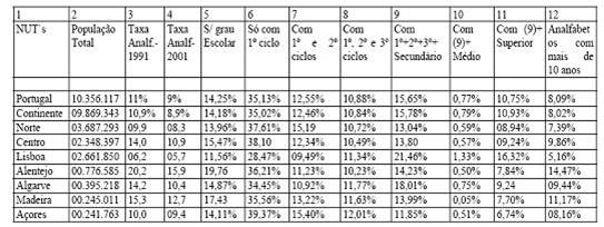 População com ensino superior duplica mas alfabetização persiste Embora a taxa de analfabetismo tenha reduzido em Portugal entre 1991 e 2001, o seu valor é ainda elevado, conforme indicam os resultados dos Censos do INE. Em Portugal, 11% da população (10 e mais anos) era analfabeta em 1991, passando esse valor para 9% em 2001. Pelo contrário, o número de pessoas com 21 e mais anos que concluíram o ensino superior duplicou neste período, passando de 4% em 1991 para 8.6% em 2001. Em 2001, 37.8% dos residentes literados em Portugal tinham completado o 1º ciclo do ensino básico, 18.8% o 2º ciclo, 18.7% o 3º ciclo, 15% o ensino secundário e 8.9% da população completou o ensino superior. Entre 1991 e 2001, o analfabetismo reduziu principalmente no Alentejo e no Algarve, -4.3% e -3.8% respectivamente. No entanto, são os concelhos do Alentejo que continuam a registar as maiores taxas de analfabetismo, fazendo com que esta região seja a que apresenta o maior valor do país, 15.9%, seguindo-se-lhe a Região Autónoma da Madeira com 15.3%. A região que continua a registar a taxa mais baixa do país, com valores muito abaixo do nacional, é Lisboa (5.7%), e o concelho Oeiras, com 3.7%. Sem significativa discrepância regional, temos a proporção de população com ensino superior, que duplicou nestes últimos 10 anos em todas as regiões do país. As mulheres são as que têm maiores habilitações literárias, existindo 72 homens com curso superior por cada cem mulheres em idêntica situação. Já quanto aos mestrados e doutoramentos, é visível a supremacia dos homens. Por outro lado, são também as mulheres que registam maiores níveis de analfabetismo (quase o dobro dos homens), uma situação justificada pelo aumento do peso dos idosos, em especial do sexo feminino. A caracterização da população passa não só por conhecer a sua estrutura etária, mas também a sua situação perante o trabalho, ou seja, em diferenciar população activa de população não activa.