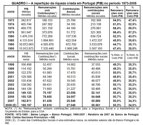 O PIB, ou seja, a riqueza criada em 2008 é cerca de 97,2 vezes superior ao PIB de 1973. O valor das remunerações em 2008, sem contribuições, é 69,8 vezes superior às remunerações sem contribuições sociais de 1973. Portanto, o PIB aumentou muito mais vezes que as remunerações neste período, o que teve como consequência um agravamento na repartição da riqueza. Mesmo se considerarmos as remunerações, com as contribuições para a Segurança Social e para a CGA a situação não se altera significativamente. Entre 1973 e 2008, O PIB cresceu 97,2 vezes, como já se referiu, e as remunerações, com contribuições, aumentaram 89,1 vezes. Estes dados oficiais mostram duas coisas. Em primeiro lugar, que as condições de vida dos trabalhadores portugueses em 2008 são muito superiores às que tinham em 1973. E isto já sem entrar em conta com a Segurança Social e o Serviço Nacional de Saúde que abrangem a totalidade da população portuguesa, situação essa, que não se verificava antes do 25 de Abril onde menos de um terço da população estava abrangida por uma previdência extremamente deficiente e por um sistema de saúde insuficiente e maioritariamente privado. Em segundo lugar, estes dados também revelam uma situação preocupante que é a seguinte: a repartição da riqueza em Portugal tem-se agravado de uma forma contínua e acentuada depois do período 1974-1976, sendo actualmente pior da que se verificava em 1973. Efectivamente, se analisarmos a evolução verificada no período 1973-2008, concluímos que entre 1973 e 1975 a parte que a remuneração, sem incluir as contribuições sociais, representava do PIB aumentou de uma forma continua e significativa, pois passou de 47% para 59% do PIB entre 1973 e 1975, tendo-se depois verificado uma diminuição continua e significativa, alcançando com o governo de Sócrates, em 2008, apenas 34% do PIB. E a previsão é que sofra uma nova redução em 2009 como prevê o próprio Eurostat, cujos dados se apresentam seguidamente. Repartição de rendimentos na crise económica Os trabalhadores do sector público que ganham mais de 1.500 euros por mês deverão ter uma perda de poder de compra de 9,1 pontos percentuais acumulada em 2011 e 2010, anunciou hoje o STE. De acordo com um comunicado do Sindicato do Quadros Técnicos do Estado (STE), a taxa de inflação de 2,2 por cento prevista pelo Governo «corre o risco de não ser confirmada», considerando o sindicato que a previsão de 2,7 por cento anunciada em Janeiro pelo Banco de Portugal é «mais realista», tendo em conta a evolução previsível do preço do petróleo. Assim, os trabalhadores do sector público detentores de um vencimento mensal acima dos 1500 euros e que deverão ter em média uma diminuição de 5 por cento no seu salário em 2011, arriscam-se a ter uma perda do poder de compra avaliada em 7,7 pontos percentuais este ano, quando já tiveram uma quebra de 1,4 pontos percentuais em 2010, perfazendo uma diminuição acumulada de 9,1 pontos percentuais destes dois anos, anulando por completo o aumento registado em 2009, diz o documento. Segundo o STE, os trabalhadores que ganham abaixo dos 1500 euros também perdem poder de compra: um total de 4,1 pontos percentuais no conjunto dos dois anos. «Globalmente, as famílias portuguesas vão ver o seu rendimento disponível real diminuir em 2,4 por cento em 2011», diz o STE, citando dados do Banco de Portugal. Esta diminuição deve-se ao corte salarial para muitos trabalhadores, à redução de algumas prestações sociais, nomeadamente o abono de família, ao aumento dos impostos (IVA e IRS) e das contribuições sociais, e à subida da taxa de inflação, justifica o sindicando. No comunicado o STE salienta que os preços em Portugal subiram para 3,6 por cento em Janeiro - o valor mais elevado desde meados de 2006 - sobretudo devido à subida dos preços da energia e dos produtos alimentares não transformados. O STE chama ainda a atenção para «o facto de tanto os preços dos produtos energéticos como dos produtos alimentares, especialmente os não transformados, estarem a aumentar mais em Portugal do que na média da área do euro». Pelo terceiro ano consecutivo, o poder de compra dos portugueses permaneceu nos 78% da média da União Europeia (UE), o que faz com que Portugal continue a ser o nono país mais pobre entre os 27 estados-membros, este ano novamente empatado com Malta. Os dados referentes a 2009, revelados ontem pelo Eurostat, mostram que o PIB per capita medido em paridades de poder de compra - indicador que mede a distribuição da riqueza do país por habitante - se manteve inalterado em Portugal, no valor mais baixo dos últimos 12 anos, excluindo 2004. A flutuação, ainda assim, tem sido balizada entre os 81% e os 77% da média da UE. Isto significa que o poder de compra da população portuguesa se tem mantido praticamente inalterado desde 1998. Os números revelam ainda que, seis anos depois, Malta voltou a atingir o mesmo nível de PIB per capita que Portugal, que continua atrás de países como a Eslovénia, a Grécia, Chipre e Espanha. No caso da Grécia, as comparações com Portugal não têm parado nos últimos meses graças à crise da dívida pública europeia. Se em grande parte dos indicadores, Portugal se destaca pela positiva quando comprado com a Grécia, este não é o caso. Os gregos estão apenas 5% abaixo da média da UE, enquanto os portugueses estão 22% abaixo.