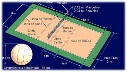 O que é o voleibol ? O voleibol é um desporto jogado entre duas equipas num campo rectangular dividido por uma rede. O objectivo do jogo é fazer a bola cair no campo do adversário, enviando-a por cima da rede e impedir que a bola caia no seu próprio campo. Cada equipa pode dar 3 toques na bola (não a mesma pessoa). A bola é colocada em jogo com um serviço: o jogador atira a bola enviando-a por cima da rede para o campo adversário. A bola continua em jogo até que caia dentro do campo. Os jogadores mudam de posição quando é a sua vez de lançar a bola, efectuando um movimento de rotação sempre no sentido dos ponteiros do relógio. Como se joga voleibol? O voleibol foi criado em 9 de Fevereiro de 1895 por William George Morgan nos Estados Unidos da América. O objectivo de Morgan, que trabalhava na "Associação Cristã de Moços"(ACM),era criar um desporto de equipas sem contacto físico entre os adversários, de modo a minimizar os riscos de lesões. Inicialmente jogava-se com uma câmara de ar da bola de basquetebol e foi chamado Mintonette, mas rapidamente ganhou popularidade com o nome de volleyball. O criador do voleibol faleceu em 27 de Dezembro de 1942 aos 72 anos de idade. Em 1947 foi fundada a FIVB. Dois anos mais tarde, foi realizado o primeiro Campeonato Mundial de Voleibol da modalidade, apenas para homens. Em 1952, o evento foi estendido também ao voleibol feminino. No ano de 1964 o voleibol passou a fazer parte do programa dos Jogos Olímpicos, tendo-se mantido até a actualidade. Regras de voleibol: * Área de jogo * Dimensões * Composição das equipas * Localização dos participantes Área de jogo A área de jogo compreende o campo de jogo. Ele deve ser rectangular e simétrico, dividido por uma rede central