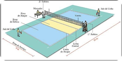 Dimensões: O campo de jogo é um rectângulo que mede 18m x 9m, circundado por uma zona livre com, no mínimo, 3m de largura.