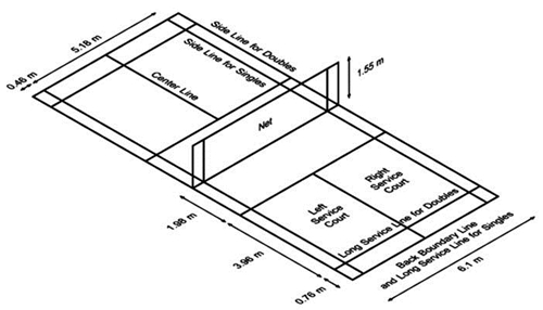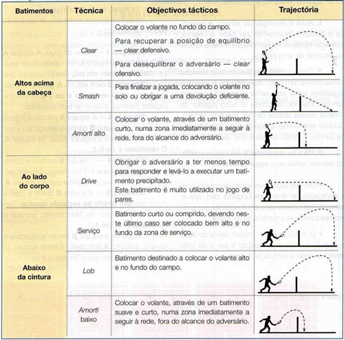 Campo e Material O recinto oficial de jogo é rectangular com um comprimento de 13,40 metros. A largura e de 6,10 metros no campo de pares e de 5,18 metros no campo singular. O campo é dividido por uma rede suspensa em dois postes de 1,55 metros, colocados sobre as linhas laterais do campo. No entanto, a altura ao centro da rede é mais comprida e estreita, enquanto a área de serviço de pares e mais carga e mais curta, conforme pode ser verificado na ilustração do campo. O volante e um projéctil muito leve com uma massa de 5 gramas e é feito de material sintético, plástico ou penas ganso. A raquete é constituída por diferentes partes: cabeça (armação e encordoamento), cabo e pega.