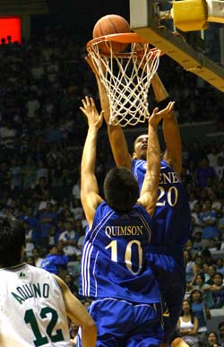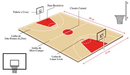 zonas próximas do peito. 1. Colocar os cotovelos junto ao corpo; 2. Avançar um dos apoios; 3. Executar um movimento de repulsão com os braços; Passe de Saia – Quando estiver de costas para o seu companheiro, joga a bola por debaixo das pernas, fazendo com que ela pique e vá para o companheiro. 1. Executar rotação dos pulsos; 2. Após passe, ficar com as palmas das mãos viradas para fora e os polegares a apontar para dentro e para baixo; 3. Dirigir o passe para baixo (solo) e para a frente. Passe de ombro: (ou de basebol) – É utilizado nas situações que solicitam um passe comprido. A bola é arremessada como no arremesso de uma bola no basebol (daí o nome). É um tipo de passe com uma trajectória tensa (sem arco), e em direcção ao alvo. Determinantes técnicas: 1. Segurar a bola com as duas mãos e por cima do ombro; 2. Colocar o cotovelo numa posição levantada; 3. Avançar o corpo e a perna do lado da bola; 4. Fazer a extensão do braço e finalizar o passe para as distancias maiores Passe por cima das cabeças: É usado quando existe um adversário entre dois jogadores da mesma equipa. 1. Determinantes técnicas: 2. Elevar os braços acima da cabeça; 3. Avançar um dos apoios; 4. Executar o passe com o movimento dos pulsos e dos dedos. Regras de Drible Um jogador não poderá tirar o pé-de-pivô do chão para iniciar uma progressão sem antes executar um drible. Um jogador poderá tirar o pé-de-pivô do chão para executar um passe ou um arremesso, mas a bola deverá deixar sua mão antes que o pé retorne ao solo. O pé-de-pivô é determinado da seguinte forma: Jogador recebe a bola com um dos pés no chão: Aquele pé é o pé-de-pivô. Jogador recebe a bola com os dois pés no chão: Quando retirar um dos pés, o outro será considerado pé-de-pivô. Jogador recebe a bola no ar e um dos pés toca o solo antes do outro: o pé que primeiro toca o solo é o pé-de-pivô. Jogador recebe a bola no ar e cai com os dois pés ao mesmo tempo: Quando retirar um dos pés, o outro será considerado pé-de-pivô. Um jogador que esteja driblando ou receba um passe durante uma progressão (ou seja, correndo), pode executar dois tempos rítmicos e, a seguir, arremessar ou passar a bola; isso não significa necessariamente dois passos (como é mais comumente executado), pois o jogador pode, por exemplo, executar dois saltos consecutivos; desde que mantenha o mesmo ritmo. Mas o esquema dos passos não é a única restrição. Você também não pode: driblar a bola, pegá-la com as mão e driblá-la novamente; Não pode driblar a bola com ambas as mãos; Não pode apoiar a bola por baixo, ou seja, conduzir a bola levando a mão sob a bola. Todos estes aspectos são considerados drible ilegal e tem a mesma penalidade da caminhada. Regras de tempo Falando sobre tempo: . A qualquer momento do primeiro e segundo período a equipe tem direito a dois descontos de tempo, que não se acumulam para os períodos seguintes; no terceiro e quarto períodos a equipa tem direito a três descontos de tempo. . Os intervalos entre cada período são de 2 minutos, mas entre o 2º e 3º há um intervalo de 15 minutos. . Não é permitido ficar dentro do garrafão por mais de 3 segundos com posse de bola. . Não é permitido ficar com a bola mais de 8 segundos no meio campo defensivo. . A equipe que tem 24 segundos para lançar a bola ao cesto do adversário. . Não se pode estar parado a segurar a bola durante mais de 5 segundos. Expressões utilizadas Duplo-Duplo O desempenho de um jogador numa partida de basquetebol é avaliado segundo vários requisitos: números de pontos marcados, assistências efectuadas, ressaltos ofensivos e defensivos, bloqueios de lançamento, roubos de bola, etc. Assim, um jogador obtêm um duplo-duplo quando consegue 10 ou mais, em dois desses requisitos. Daí o nome de duplo, devido aos dois dígitos. Triplo-Duplo O jogador obtém um triplo-duplo quando conseguir 10, ou mais, em três requisitos. O campo de basquetebol tem 26 metros de comprimento por 14 metros de largura. Os cestos estão à altura de 3,05 metros do chão nas extremidades do campo. Quando a bola entra no cesto do adversário, a equipa ganha 2 pontos. Se o lançamento for feito antes da linha situada a 6,25 metros do cesto, é triplo e o cesto vale 3 pontos. Federação Internacional de Basquetebol A Associação foi fundada em Genebra em 1932, dois anos depois do desporto ser oficialmente reconhecido pelo Comité Olímpico Internacional (COI). Foi baptizada como Fédération Internationale de Basketball Amateur. Os oito membros fundadores foram a Argentina, Checoslováquia, Grécia, Itália, Letónia, Portugal, Roménia e Suíça. Durante os Jogos Olímpicos de Verão de 1936, em Berlim, A federação nomeou James Naismith (1861-1939) como fundador do basquetebol e seu presidente honorário. A FIBA organiza seu campeonato mundial masculino desde 1950 e o Campeonato Mundial Feminino desde 1953, acontecendo de quatro em quatro anos, alternando com o ano em que se organiza as Olimpíadas. A partir de 1989, a FIBA passou a permitir a presença de profissionais em suas competições, principalmente as olimpíadas, possibilitando assim que os atletas da NBA pudessem participar dos Jogos. Desse momento em diante a FIBA retirou de seu nome o amateur (o qual caracterizava o cunho amador da federação), porém manteve a abreviação FIBA. Em 1956 a FIBA foi transferida para Munique, voltando para Genebra apenas em 2002. Patrick Baumann é o actual secretário-geral da FIBA. NBA A National Basketball Association (ou NBA) é a principal liga de basquetebol do mundo, sendo localizada na América do Norte. Ela foi criada em 1946 sob o nome de BAA (Basketball Association of America). Em 1949, se fundiu com a NBL (National Basketball League) e foi renomeada NBA. O campeonato compreende 30 franquias (clubes) (29 estado e 1 canadense), divididas em 2 conferências (Leste e Oeste), estas por sua vez também dividida 