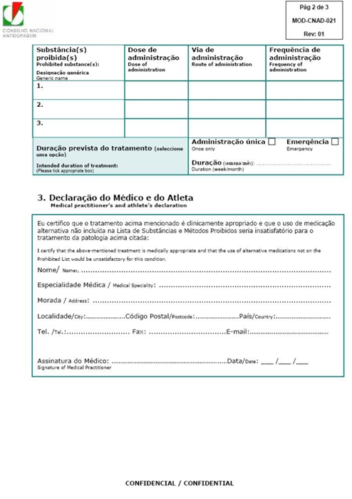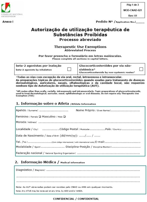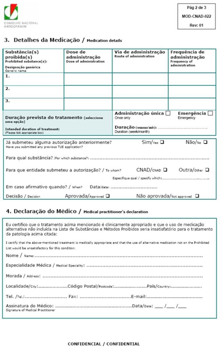 A imagem anterior mostra o efeito dos beta-bloqueantes no organismo. Hormonas Peptídicas As hormonas peptídicas têm diversas funções. Uma as principais é a fixação peptídica, ou seja, ajudam os músculos nas suas funções anabólicas, contribuindo assim na fixação da aminoácidos necessários para a construção destes. Existem vários tipos destas hormonas, tendo cada uma a sua respectiva função: . Eritropoetina – Também conhecida como EPO. Estimula a produção de glóbulos vermelhos, aumentando assim a resistência dos atletas. . hCG – Hormona produzida por um feto durante a gravidez, é também utilizada pelos homens para aumentar a produção de esteróides. Existem também mulheres que engravidam para aumentar a concentração de hormonas femininas que a hCG provoca. Depois do teste de controlo, estas atletas abortam. . HC – Hormona do crescimento, que tal como o nome indica é produzida em grandes quantidades durante a puberdade e permite o crescimento dos indivíduos e a recuperação dos tecidos musculares. . LH – Hormona que existe naturalmente no nosso organismo e que é utilizada para estimular a produção de testoesterona no testículos. A utilização destas drogas pode provocar, entre outras coisas deformações ósseas, miopia, distúrbios hormonais, coágulos sanguíneos, diabetes, hipertensão e doenças articulares. Diuréticos Também apelidados de substâncias mascarantes, estas têm como tarefa aumentar a quantidade de urina produzida, o que leva a alterações no seu controlo, visto que a maior parte das substâncias são ilegais quando encontrada em grandes quantidades. Os diuréticos são também usados para a perda de peso em desportos divididos por categorias de peso. Os mais populares entre os desportistas são o triantereno e a furosemida. Como efeitos secundários podem causar desidratação, doenças renais, perda de sais minerais, cãibras, alteração do volume do sangue e no ritmo cardíaco. Se algum destes se tornar muito grave, pode provocar a morte do indivíduo. Beta-Agonistas Este é o último grande grupo de drogas dopantes. Os beta-agonistas são drogas que se destinam a aumentar a massa muscular e diminuir a massa gorda. Uma droga beta-agonista muito conhecida é a adrenalina, que existe espontaneamente no nosso organismo e que é libertada quando estamos sujeitos a situações de grande tensão (é por isso que, quando ameaçados ou em perigo, o homem consegue faz certas proezas ou utilizar certa força que normalmente não conseguiria usar) Como efeitos secundários prejudiciais temos o aparecimento de insónias, agressividade, tremores e náuseas, falta de concentração, distúrbios psíquicos, aumento da pressão arterial, problemas cardiovasculares... Outras drogas Outras substâncias igualmente proibidas nas competições internacionais são ainda o álcool, todo o tipo de narcóticos estupefacientes e ainda drogas anti-estrogénicas, ou seja, drogas que se destinam a inibir a produção destas hormonas. Este tipo de drogas é proibido pois está geralmente associado ao consumo de esteróides anabolizantes (são utilizadas devido ao efeito aromatizante dos esteróides). Por fim, e a apesar de não serem propriamente consideradas substâncias dopantes, existem também técnicas e métodos proibidos no desporto. São eles: . Aumento do transporte de oxigénio: esta técnica consiste no uso de substâncias (como o EPO) para aumentarem o número de glóbulos vermelhos ou a transfusão de sangue previamente retirado e enriquecido com glóbulos vermelhos. Este método é perigoso pois maior número de glóbulos vermelhos significa sangue mais viscoso, e como tal há um maior risco de ataque cardíaco. . Manipulação química e física: conjunto de técnicas que visa alterar a validade e a integridade das amostras de urina e sangue usadas nos controlos antidoping. Entre elas destacamos a alteração das amostras de urina, a inibição da excreção renal e o uso de substâncias mascarantes. . Doping genético: a dopagem genética é definida como o uso não terapêutico de genes, elementos genéticos ou células que tenham a capacidade de aumentar o rendimento desportivo. Este tipo de doping está ainda em desenvolvimento e ainda não é muito viável, mas poderá ser uma realidade num futuro bem próximo. Esse tipo de doping é usado com recurso a vírus ou bactérias que alteram certos genes em certos músculo do organismo, tornando-o mais adaptado à actividade que pratica. 3. Substâncias Terapêuticas Abaixo estão citadas algumas substâncias terapêuticas, proibidas e permitidas no tratamento de algumas patologias que o atleta pode sofrer. As substâncias mencionadas são apenas alguns exemplos das que podem ser utilizadas actualmente. CATARRO, TOSSE E FARINGITE PROIBIDAS: Medicamentos que contenham Codeína, Efedrina, Propanolamina (Bisolvon compositum)PERMITIDAS: Bromexina (Bisolvon), Dextrometarfano, Doperastina, Zipeprol, Inalações de Mentol, Aerosóis Nasais (Brometo de Ipatrópio e Oximetazolina) e Antibióticos.DIARREIA PROIBIDAS: Morfina e Codeína.PERMITIDAS: Loperamida, Difenoxilato.ASMA E FEBRE DOS FENOS PROIBIDAS: Medicamentos que contenham Efedrina e Pseudoefedrina.PERMITIDAS: Terbutalina, Salbutamol, Corticóides (só em aerosol), Teofilina e Antiestamínicos.DOR DE CABEÇA PROIBIDAS: Medicamentos que contêm Codeína e DestropropoxifenoPERMITIDAS: Aspirina e Paracetamol.DOR MENSTRUAL PERMITIDAS: Ibuprofeno, Buscapina.CONTUSÕES E TRAUMATISMOS PROIBIDAS: Medicamentos que contenham Codeína.PERMITIDAS: Anti-inflamatórios não esteróides.VÓMITOS PERMITIDAS: Primperan.4. Documentos e Autorizações Os documentos abaixo apresentados são dois exemplos de autorizações que os médicos responsáveis têm que preencher para solicitar/justificar a necessidade do atleta tomar medicamentos que contenham substâncias não permitidas pelas leis.