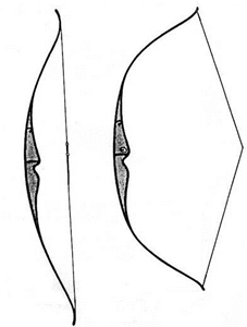 Arco encordoado (corda em repouso) e arco armado (corda para tiro), respectivamente.