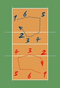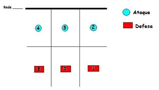 Antes da execução do serviço pela equipa contrária é obrigatório que: . o jogador da posição 3 esteja entre os jogadores das posições 4 e 2; . o jogador da posição 4 esteja à esquerda do jogador da posição 2; . o jogador da posição 6 esteja entre os jogadores das posições 5 e 1; . o jogador da posição 5 esteja à esquerda do jogador da posição 1; . os jogadores das posições 1, 6 e 5 têm de estar, respectivamente, atrás dos jogadores, das posições 2, 3 e 4. Estas mesmas relações são aplicadas à equipa que vai servir, com excepção do jogador que realiza o serviço, podendo este efectuá-lo em qualquer ponto da zona de serviço. Rotação O conhecimento da formação (posição inicial de cada jogador) é fundamental para a execução da rotação, a qual é efectuada no sentido dos ponteiros do relógio. A título de exemplo, o jogador que joga à entrada da rede, na posição 4, deve deslocar-se para a posição 3, enquanto o jogador da posição 6 passa para a posição 5 e assim sucessivamente. No jogo 4 contra 4, a rotação segue os mesmos princípios definidos para o jogo 6 contra 6.