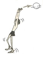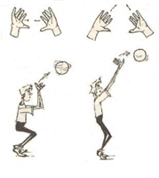 o jogador deve: . Flectir as pernas, com os pés afastados, um à frente do outro. . Colocar as mãos acima e à frente da testa, com os dedos afastados, e com os polegares e indicadores formando um triângulo; . Colocar-se debaixo da bola e tocá-la com todos os dedos;