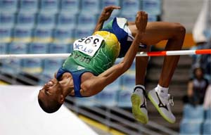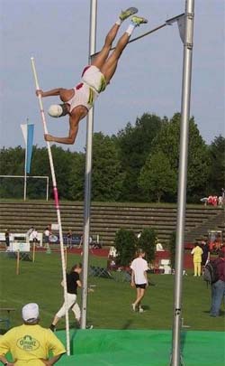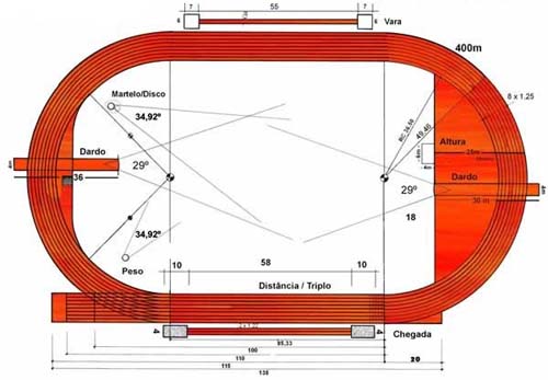 vara aconteciam na Grécia antiga. Até A pista oficial no salto com vara deve medir no mínimo 45m. O atleta deve saltar sobre um travessão - a fasquia ou sarrafo - apoiado em duas traves verticais. São permitidas um máximo de três tentativas para cada altura escolhida pelo atleta, o qual pode se recusar a saltar sob determinadas alturas com o intuito de alcançar mais rapidamente marcas maiores. Contam como faltas a queda do sarrafo, tanto pelo corpo do atleta quanto pela vara, e a mudança da posição das mãos após a vara ser fincada na caixa de apoio. Três faltas seguidas acabam com a prova. Lançamento do disco