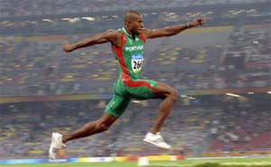 Pulo, passo e salto. 1- O atleta esforça-se por ganhar velocidade na corrida de balanço, por causa da rapidez e da distância que irão perder cada vez que fizerem a chamada. 2- O pulo de chamada deve ser rápido e enérgico. Batem na tábua de chamada com o pé todo e avançam com essa perna, atirando-a para cima, de forma a que a sua coxa fique paralela à pista. 3- Arremessam a perna esquerda para uma posição horizontal, de maneira a ficar paralela ao chão e lhes impulsionar o joelho direito para trás. Nesta fase de contacto intermédio tentam “cravar” o pé esquerdo no chão, da frente para trás, atirando, assim, o corpo para a frente. 4- Ao caírem, os seus pés devem estar um pouco à frente dos joelhos e das ancas. Serão impulsionados para a frente pelo pé em que caem, “cravado” no chão, bem como pela oscilação do joelho direito. 5- Aproveitando ainda o movimento oscilatório de um só braço, entram na fase do passo. O voo é semelhante ao do pulo. Com as pernas bem afastadas, levantam a perna direita e arremessam-na para a frente. 6- Este passo de contacto intermédio é o mais difícil do triplo salto porque é executado com a perna mais fraca e porque já terão perdido imensa velocidade e ímpeto nas duas chamadas anteriores. Quando, caírem, lançam os braços para a frente preparando, assim, a sua próxima chamada. 7- Partem imediatamente com a perna do contacto intermédio. A chamada do salto é mais elevada do que a do pulo e do passo, e faz um ângulo de 20-24º. 8- Quando levarem o joelho direito ao encontro do esquerdo, pareceram suspensos no ar, por instantes, até dobrarem o corpo para a frente, pronto a aterrar. A este movimento chama-se “salto pairante”. 9- Quando tocarem na areia, projectam os braços para a frente e deixam que os joelhos se dobrem um pouco - impedindo que o corpo caia para trás ao aterrarem. As medidas de distância do triplo salto, bem como do salto em comprimento, são medidas a partir da tábua de chamada até à marca mais próxima que existir na areia. Por conseguinte, devem sempre tentar cair para a frente, na aterragem e afastarem-se pela frente do buraco. Se caírem ou andarem para trás, os seus saltos serão medidos a partir da distância mais curta. Salto em comprimento