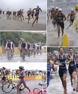 natação, ciclismo e cor Pode-se dizer que o triatlo moderno surgiu no San Diego Track Club na década de 1970. A primeira grande competição de triatlo, entretanto, foi o Ironman Triathlon, organizado em 1978 no Havaí. Naquela ocasião, a competição foi organizada com o intuito de esclarecer qual dos atletas (nadador, ciclista ou corredor) era o melhor condicionado fisicamente, que possuía a maior resistência. Era uma competição genuinamente individual, na qual não era permitida interacções entre alguns competidores que viessem a prejudicar os demais. A modalidade estreou no programa nos jogos de Sydney no ano 2000, após sofrer algumas modificações estabelecidas pela União Internacional de Triatlo (ITU), fundada em 1989. Tais modificações, aplicadas com o fim de tornar a modalidade mais atractiva ao público, alteraram consideravelmente a dinâmica da prova e afastaram-na dos princípios que guiaram o nascimento da modalidade, mas aproximaram o desporto de requisitos necessários para ingressar no âmbito dos desportos olímpicos. Algumas das alterações mais importantes para que o triatlo se tornasse um desporto olímpico dizem respeito aos uniformes e a exposição de logo-marcas de patrocinadores nos uniformes dos atletas. Pode-se classificar as provas de triatlo de acordo com as distâncias percorridas e com os locais onde as provas são disputadas. As principais são as seguintes: . Sprint: 750 metros de natação / 20 km de bicicleta / 5 km de corrida . Olímpico: 1.5 km de natação / 40 km de bicicleta / 10 km de corrida . Ironman: 3.8 km (2.4 milhas) de natação / 180 km (112 milhas) de bicicleta / 42 km (26.2 milhas) de corrida Provas Combinadas Algumas competições desportivas envolvem uma combinação de várias modalidades, no intuito de consagrar uma atleta mais completo. As provas oficiais do decatlo (para os homens) e do heptatlo (para as mulheres) combinam corridas, saltos e lançamentos. Os atletas pontuam de acordo com as suas marcas nas provas individuais (tendo por base uma tabela de conversão de marcas por pontos), e esses pontos são somados para definir-se o vencedor. O decatlo que é para homens consiste em dez provas em dois dias: os 100 e 400 m, o salto em altura, o salto em comprimento, o lançamento do peso, os 1500 m, os 110 m barreiras, o salto à vara, o lançamento do dardo e o lançamento do disco. O primeiro decatlo moderno foi levado a cabo na Alemanha, em 1911, e todas as provas se deram no mesmo dia. Surgiu nas Olimpíadas em 1912, e, tal como actualmente, demorou dois dias. O heptatlo que é para mulheres consiste em sete provas em dois dias também: os 100 m barreiras, o salto em altura, o lançamento do peso, os 200 m, os 800 m, o salto em comprimento e o lançamento do dardo. O heptatlo (para as mulheres), foi introduzido em 1981 para substituir o pentatlo, que abrangia cinco provas. Acrescentou-se-lhe o lançamento do dardo e os 800 metros, para acentuar a força, bem como a velocidade. Em cada conjunto de provas o vencedor é escolhido por um sistema de pontuação, no qual os competidores obtêm pontos pelo tempo, distância e velocidade demonstrados em cada prova. Ganha o atleta com a pontuação mais alta. Heptatlo Primeiro Dia 100 metros Barreiras As provas no heptatlo têm 30 minutos de intervalo entre si. O conjunto de modalidades põe à prova a velocidade, a força, a agilidade e a resistência de uma atleta. O treino para esta primeira prova - os 100 m barreiras - também beneficia os 200 m. Salto em Altura Neste salto a técnica e a agilidade são postas à prova. As regras são as mesmas que na modalidade individual, mas as atletas são divididas em grupos com padrões semelhantes. As atletas comem alimentos energéticos ao longo do dia. Lançamento do Peso Serve para pôr à prova a força de uma atleta. As distâncias alcançadas no heptatlo são frequentemente mais baixas do que nas provas individuais, porque a atleta é muito mais leve, e aumentar-lhe o peso corporal para esta prova poderia prejudicar a sua actuação nas outras. Nos lançamentos, as atletas dispõem apenas de três tentativas. 200 metros Esta prova é praticada no fim do primeiro dia, quando a atleta começa a sentir-se cansada. Por isso, é tanto uma prova de resistência como de velocidade. Segundo Dia Salto em Comprimento As atletas só fazem três tentativas neste salto. A velocidade é também vital, para assegurar uma boa corrida de balanço. Lançamento do Dardo A capacidade técnica bem como a força do tronco são vitais no arremesso do dardo. Nas provas individuais, as lançadoras do dardo são baixas e leves. A maior parte das atletas do heptatlo são constituição semelhante e, muitas vezes, conseguem pontuar bastante nesta prova. 800 metros O segredo é mais a resistência do que a velocidade. Nesta fase, a atleta devia concentrar-se na marcação dos pontos de que necessita para estabelecer o resultado final e devia ter por objectivo regular a sua passada. Decatlo Primeiro Dia 100 metros Esta é a primeira prova do primeiro dia. Nas modalidades de pista, permite-se aos atletas três falsas partidas, em contraste com as duas habituais. Salto em Comprimento Depois da velocidade dos 100 m, este salto põe à prova a capacidade técnica do atleta. Os atletas que praticam provas combinadas devem iniciar cada uma delas, ou serão desqualificados. No entanto, se não completarem a prova por falha de um salto, por exemplo, nesse caso não marcaram pontos, o que pode ser desastroso para o resultado final. Lançamento do Peso Como no heptatlo, um físico avultado pode beneficiar esta e outras provas de arremesso, mas talvez façam abrandar o atleta do decatlo nas corridas de velocidade e nos 1500 metros. Salto em Altura Os atletas praticantes de provas combinadas têm de aproveitar ao máximo o seu tempo de treino, e, muitas vezes, treinarem ao mesmo tempo o salto em comprimento, o salto em altura e o salto com vara. 400 metros É imp