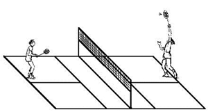 A partir desta imagem conseguimos perceber como é constituído um campo de badminton. Na figura: . saque = serviço . para duplas, quando estão a jogar equipas de dois contra dois . para simples, quando está a jogar um contra um Movimentos Técnicos: . Clear - Devolução do volante com trajectórias altas; - Batimento por cima, para passar o volante por cima do adversário e colocá-lo no fundo do campo.