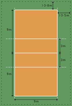 coberto. O campo mede 18 metros de co Acima da linha central, é postada uma rede de material sintético a uma altura de 2,43m para homens ou 2,24m para mulheres (no caso de competições juvenis, infanto-juvenis e mirins, as alturas são diferentes). Cada campo é por sua vez dividida em duas áreas de tamanhos diferentes (usualmente denominadas "rede" e "fundo") por uma linha que se localiza, em cada lado, a três metros da rede ("linha de 3 metros"). No voleibol, todas as linhas delimitadoras são consideradas parte integrante do campo. Deste modo, uma bola que toca a linha é considerada "dentro" (válida), e não "fora" (inválida). Acima da quadra, o espaço aéreo é delimitado no sentido lateral por duas barras postadas em cada uma das extremidades da rede. No sentido vertical, os únicos limites são as estruturas físicas do ginásio. A bola empregada nas partidas de voleibol é composta de couro ou couro sintético e mede aproximadamente 65cm de perímetro.