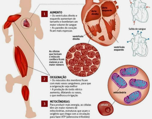 O oxigénio chega de forma mais eficiente às Pernas e aos Braços… 2. Pernas e Braços: aumento dos vasos; 3. Músculos: aumento das mitocôndrias, em virtude de receber mais oxigénio.