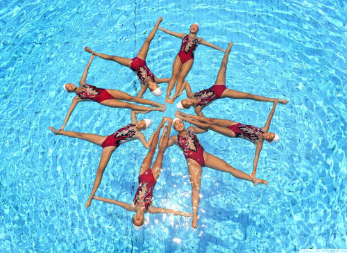 A natação sincronizada consiste na execução e uma sequencia/coreografia de movimentos rítmicos e sincronizados debaixo da agua, tendo esta um acompanhamento musical. Estas sequencias podem ser elaboradas em Solo (uma nadadora), Dueto (duas nadadoras), uma Equipa (quatro a oito nadadoras) ou um Livre Combinado (dez nadadoras). A natação sincronizada exige habilidades de força, resistência, flexibilidade, sincronismo preciso, e um controle excecional da respiração quando estiver de cabeça para baixo na água. Origem Desenvolvido na década de 1900 no Canadá, é um desporto quase exclusivamente de mulheres, embora haja alguma participação masculina. A origem do nado sincronizado é um pouco incerta, acredita-se que ele tenha surgido de acrobacia simples na água e que com a evolução dela, teria originado o ballet aquático (um pequeno esboço do que hoje chamamos natação sincronizada). Antigamente, o ballet aquático era visto apenas nos intervalos de competições de natação. Em 1891, o desporte começou a ser praticado por alemães durante uma competição desportiva em Berlim. Em 1907, a australiana Annette Kellermen tornou-o conhecido, dançando debaixo de água num tanque de vidro, em Nova York. O nome oficial “Natação sincronizada” foi lhe atribuído em 1933, durante o primeiro mundial em Chicago. A natação sincronizada foi apresentado nos Jogos Olímpicos de 1948 (Londres) Regras Hoje, as regras e os movimentos D natação sincronizada mudaram bastante. O desporte é dividido em categorias, em idades, e níveis, de acordo com o tempo de prática. Categorias: Infantil A: 9 e 10 anos Infantil B: 11 e 12 anos Juvenil: 13, 14 e 15 anos Júnior: 16 e 17 anos Sênior: acima dos 18 anos Polo aquatico Este desporto foi criado no século XIX (1870) em Londres. O Pólo Aquático é um desporto semelhante ao andebol, tendo como diferença o local onde é praticado, neste caso, dentro de uma piscina. O Objetivo do jogo, como em todos os desportos coletivos, é que as equipas introduzam a bola na baliza adversária. A equipe que marcar um número maior de golos vence a partida; Piscina