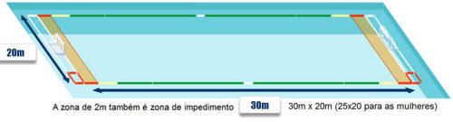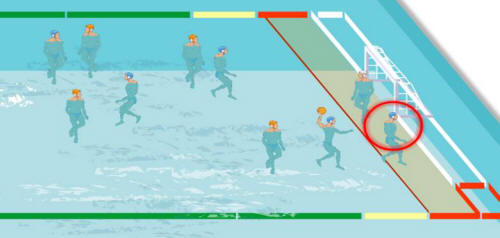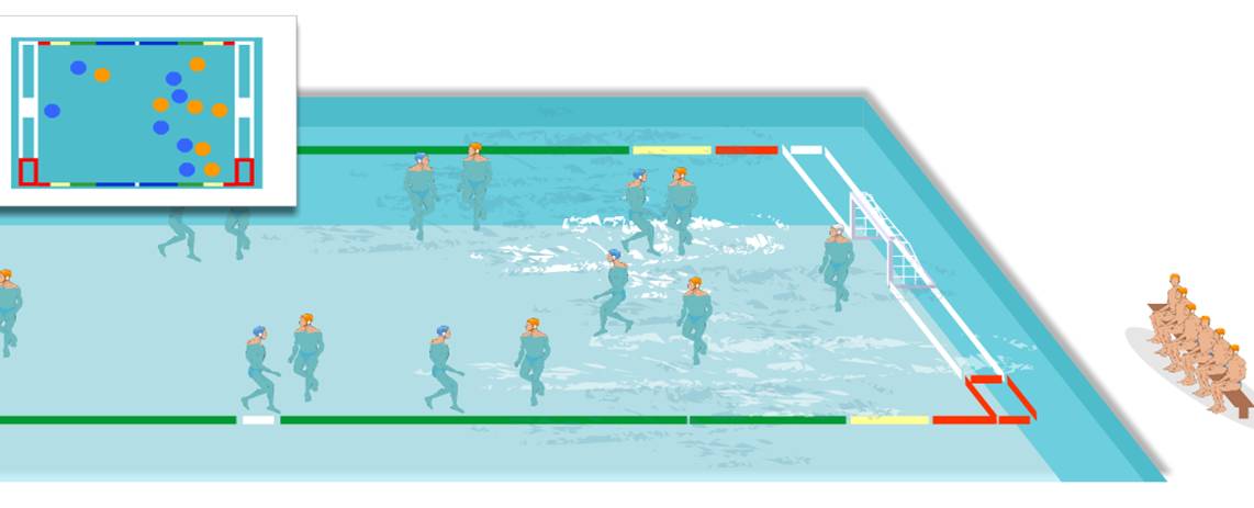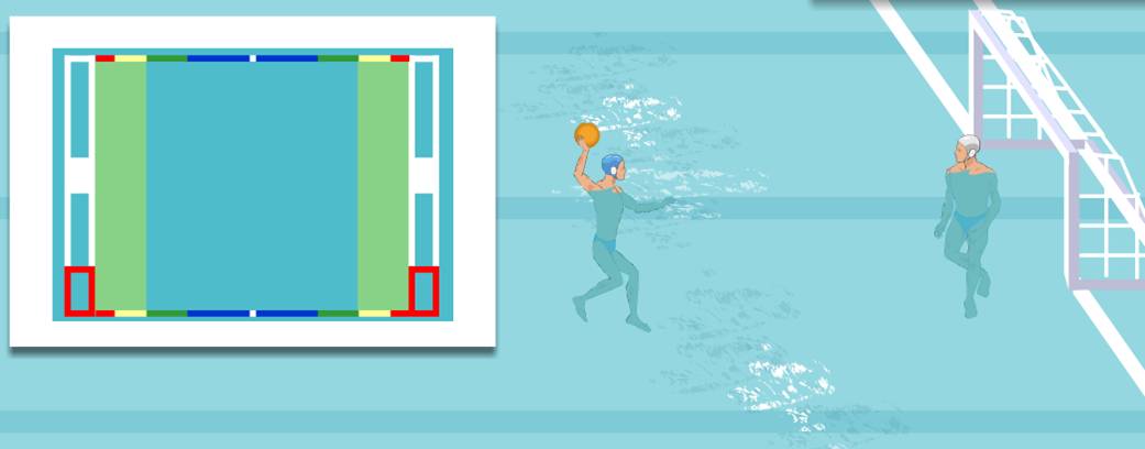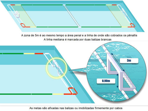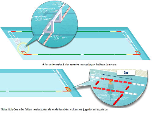 A piscina varia de seu tamanho conforme a equipa que jogar, é de 30 m x 20 m para os homens e de 25 m x 20 m para as mulheres. Tem uma zona de 2 metros que é a zona de impedimento ( assinalada de vermelho na figura), zona de 5 metros ( assinalada pela cor amarela), e alinha de meio campo (assinalada de branco). Os retângulos vermelhos nos cantos são zonas de entrada e de expulsão de jogadores.