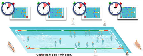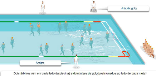 O jogo é vigiado por 4 pessoas. 2 árbitros posicionados um de cada lado da piscina 2 juízes de golo posicionados um ao pé de cada baliza. Existe ainda um arbitro de mesa que é responsável pela cronometragem do tempo Tempos O jogo realiza-se em 4 períodos de 7 minutos cada com 2 minutos de intervalo entre eles. Substituições são permitidas apenas quando uma equipa marca golo e entre períodos. No caso de empate há 2 prolongação de 3 minutos cada e, se o empate continuar, ocorre a disputa por penaltis (5 por cada equipa).