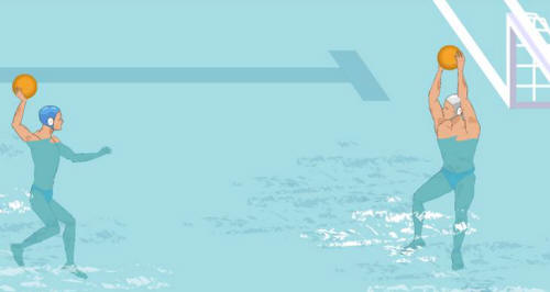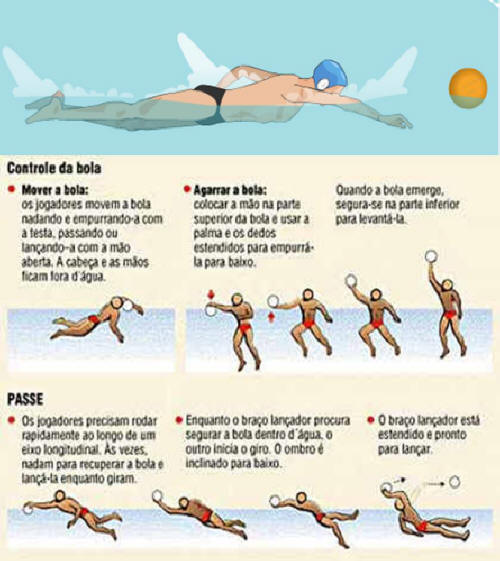 Os jogadores enquanto nadam empurram a bola com a testa. Muitas vezes a passe da bola é efetuada em nado, por isso o jogador pega na bola com uma mão, vira-se de costas e efetua o passe.