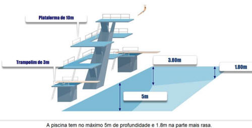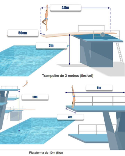 trampolim / plataforma O trampolim tem altura de 3 m de superfície da agua e é flexivel, pelo que nele podem ser efectuados saltos A plataforma encontra-se a altura de 10 m da superficie da agua e é fixa. As restantes medidas estao apresentadas nos esquemas.
