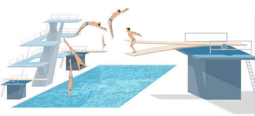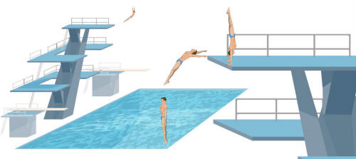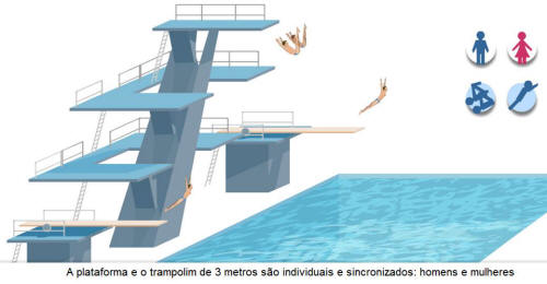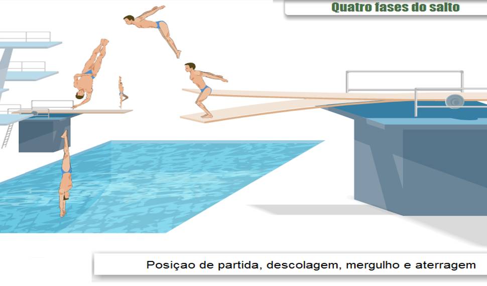 Saltos ornamentais salta para a piscina Saltos ornamentais ou saltos para a água são os nomes dados ao conjunto de habilidades que envolve saltar de uma plataforma elevada ou trampolim em direção à água, executando movimentos estéticos durante a queda. É considerado um exporte de técnica plástica e flexível. Oriundo de um movimento natural do ser humano, o ato de saltar, o desporte limita as possibilidades a uma plataforma de dez metros de altura, tendo seis quesitos avaliados. O salto ornamental consiste em um agregado de muitas habilidades que tem de se saltar de uma plataforma elevada , em direcção a água , fazendo vários movimentos belos até a queda na água. É um desporto muito flexível . Historia Surgido como forma de divertimento na Grécia Antiga. Crê-se por vestígios antigos que isto já tornou se competição antes dos Jogos. Nos século XIX , os suecos e alemães mostravam os seus saltos e acrobacias no mar. Em 1904 ( ano em qua foram apresentados nos Jogos Olímpicos e assumido como desporto independente) com a plataforma a 10 metros de distância da água, vencia aquele que fizesse o maior percurso debaixo de água em um minuto. Estes saltos tem laços com a natação e a ginástica. Piscina A piscina pode ter no maximo 5 m de profundidade e minimo de 1.8 m.