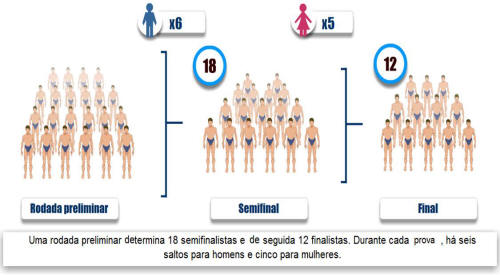 Individuais Na primeira parte são determinados 18 semifinalistas que irão competir na ate restarem 12 na prova final. Durante a provas as mulheres executam 5 saltos e os homens 6 cada um.