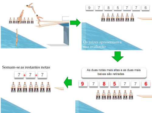 Regras Os concorrentes deverão apresentar aos juízes lista dos saltos que irão efetuar 24 horas antes da prova (se na prova apresentarem alguma coisa que não estiver na lista a demonstração é invalida. Nove juízes avaliam o atleta, sendo quatro que analisam a técnica e outros cinco encarregados de observar se o atleta mergulhou conforme o anunciado. Avaliação Aproximação (Deve ser tranquila, mas eficiente, mostrando uma boa forma) Saída: (deve mostrar controle e equilíbrio, além do ângulo correto de partida para o tipo de salto adotado) Subida: (um salto mais alto geralmente garante maior precisão e suavidade de movimento pois permite um maior tempo de movimento.) Execução: (é a acrobacia em si. O juiz observa a performance mecânica, técnica e figura do salto.) Entrada: (A entrada na água é muito significante. Os dois critérios avaliados são o ângulo de entrada deve ser o mais próximo da vertical possível, e a quantidade de água salpicada, que deve ser a menor possível.) A avaliação das provas individuais é efetuada no máximo por 7 juízes (avaliam os 5 parâmetros acima referidos) enquanto nos saltos sincronizados são 9 (4 avaliam os atletas individualmente e 5 avaliam o conjunto) Apos a execução do salto cada juiz apresenta a sua nota (de 0 a 10), são retiradas as duas notas mais baixas e as duas mais altas e a seguir é feita a soma das restantes e multiplicada pelo grau de dificuldade de salto (de 1 a 4)