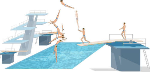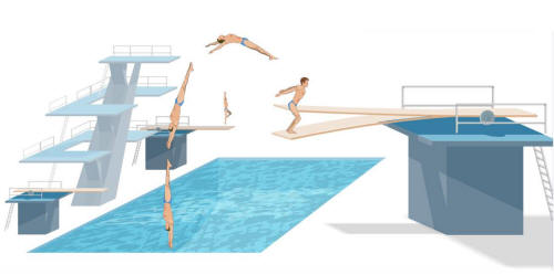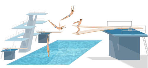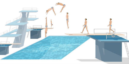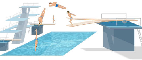 Salto simples para frente A saída é feita de frente para o trampolim. Ao saltar o atleta faz uma série de rotações em direção à água, sem alterar a posição de chegada, que será de frente.