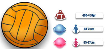 Casa jogador tem um gorro numerado na cabeça. Os guarde redes tem os gorros vermelhos A bola é amarela e é a prova da agua Os arbitros
