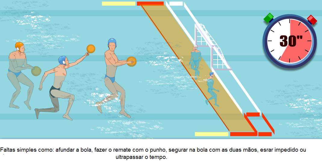 Faltas As faltas no polo aquático são divididas em simples e graves. Ao cometer uma das faltas o jogador fica 20 segundos (ou ate ser marcado um golo) fora do jogo