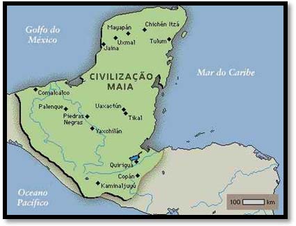 Imagem 1 - Localização da civilização Maia - Peninsula de Iucatão (México) Religião A religião era o ‘centro’ das actividades maias, visto que todas elas de desenvolviam à volta dos rituais. Entre os rituais típicos mais havia abstinência, danças, coros, música, jejum, meditações, etc. O povo maia acreditava na imortalidade da alma e por isso viam a morte com calma e naturalidade. Para os maias, o Universo era habitado por forças sobrenaturais que se manifestavam na Natureza e no mundo animal e que cediam ao homem o necessário para sobreviver. A cultura maia era “Politeista” e os principais Deuses eram: Hunak Ku (Deus Creador); Itzammá (filho de Hunab Ku); Chac (Deus da chuva e da Agricultura) e Ah Puch (deus da morte).