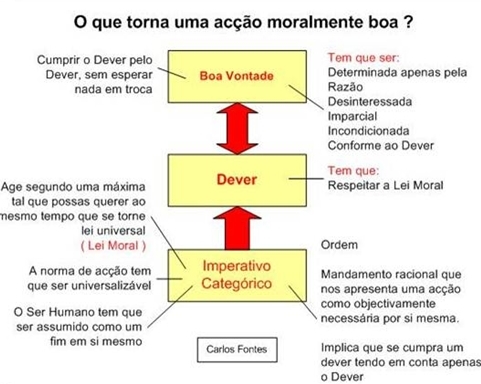 Figura 4 - Obra “A Crítica da Razão Pura” Um dos interesses de Kant era a ética como referido anteriormente. Neste campo Kant enriqueceu a área das teorias éticas ao aprofundar o saber sobre moral e a ação humana, arranjando formas para justificas as ações. O estudo de Kant incidiu sobre as éticas deontológicas que se definem por justificar uma ação e classificá-la como correta ou incorreta através da intenção do sujeito que a levou a cabo e do cumprimento do dever e da boa vontade, ignorando aspetos como os meios utilizados ou os fins que daí resultaram. Primeiramente, acho importante, termos em atenção o que Kant efetivamente disse e escreveu sobre a sua teoria ética no livro “Fundamentação da Metafísica dos Costumes”, explorando e explicando esse conteúdo numa segunda fase. "Faça de maneira que a máxima da tua vontade possa ser o tempo todo princípio de uma lei geral." "Age de modo que consideres a humanidade tanto na tua pessoa quanto na de qualquer outro, e sempre como objetivo, nunca como simples meio." Estas duas declarações tornam-se formulações do imperativo categórico criado também por Kant que, juntamente com o imperativo hipotético, determinam a ação, são como mandamentos que nos ajudam a proceder (no caso do imperativo categórico) ou nos dão a conhecer o que é necessário fazer para alcançar determinada ação (no caso do imperativo hipotético). As citações acima transcritas são, portanto, a primeira formulação do imperativo categórico e a segunda formulação do imperativo categórico, respetivamente, sendo que a primeira indica-nos que cada ação tem que servir de exemplo para o resto do mundo e para qualquer época e a segunda recomenda que cada ação deve ter o outro sempre como um fim e nunca como um meio. No entanto, Kant não se apoia apenas nas formulações do imperativo categórico para determinar a validez de uma ação. Kant dá total importância ao dever e à boa vontade que deriva exclusivamente da razão e está subordinada ao dever que segundo ele, devem estar na base de qualquer ação. O respeito pelo dever e cumprimento das regras e normas morais é bastante importante para classificar uma ação pois só assim somos unicamente guiados pela razão e intenção pura. Com isto somos conduzidos para moralidade/imoralidade e legalidade/ilegalidade de uma ação em que Kant classificou as ações em três categorias: ações contrárias ao dever, ações conformes ao dever e ações pelo dever. As ações contrárias ao dever caracterizam-se por não respeitarem nem as normais morais nem as normais legais, logo são imorais e ilegais. As ações conformes ao dever são ações que cumprem as normais legais mas não são orientadas exclusivamente pelas normais morais, são portanto, ações legais mas sem valor moral. Temos também as ações pelo dever que são realizadas com o único objetivo de cumprir as normas morais, sendo ações legais e morais. Em suma, podemos esquematizar todas estas condições que resultam numa ação moralmente válida com a seguinte figura: